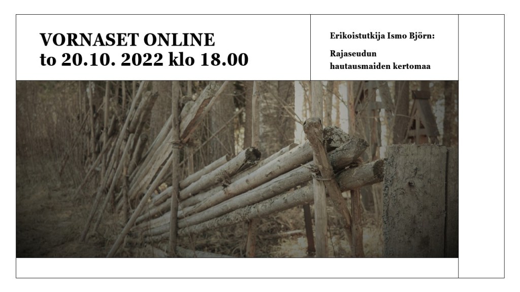 Syksyn lokakuisessa Vornaset Online -Teams kokoontumisessa Erikoistutkija, FT Ismo Björn kertoo tutkimuksistaan rajaseutujen hautausmailla ja kuinka niiden kautta tulee esille rajaseudun luonne, kulttuuriset tavat, perinteet ja eri uskonnot.