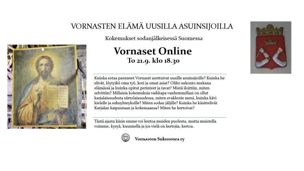 Syksy alkaa Vornaset Online -tilaisuudella torstaina 21.9. klo 18.30 alkaen. Päivitetään tuolloin asioita ja keskustellaan varsinaisesta illan teemasta, luovutetulla alueella syntyneiden, sieltä evakuoitujen Vornasten sotien jälkeisistä kokemuksista. Voit miettiä aiheeseen liittyviä muistoja ja tarinoita ja jos sinulla on vaikka jokin esine tai valokuva, josta haluat kertoa, niin kaikki sellainen on tervetullutta.