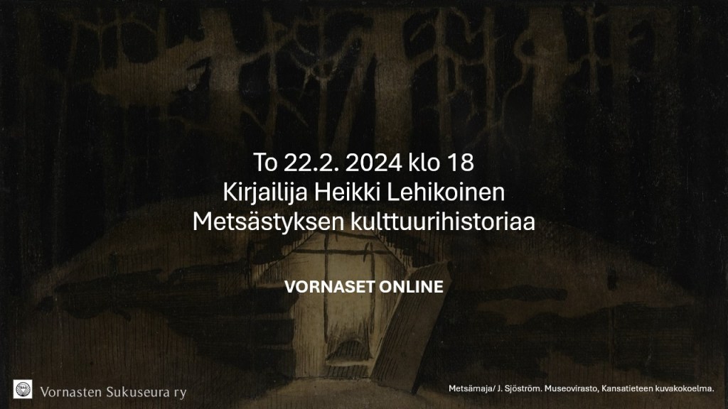 Helmikuun Vornaset Online- tilaisuudessa 22.2. 2024 kirjailija Heikki Lehikoinen kertoo metsästyksen kulttuurihistoriasta. Tilaisuus alkaa klo 18.