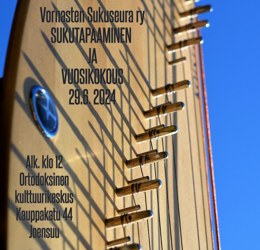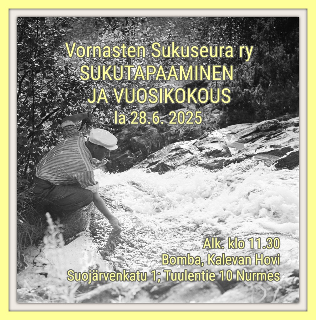 Vornasten Sukuseuran kesäinen tapaaminen ja vuosikokous pidetään lauantaina 28.6. Nurmeksessa Bomballa.
