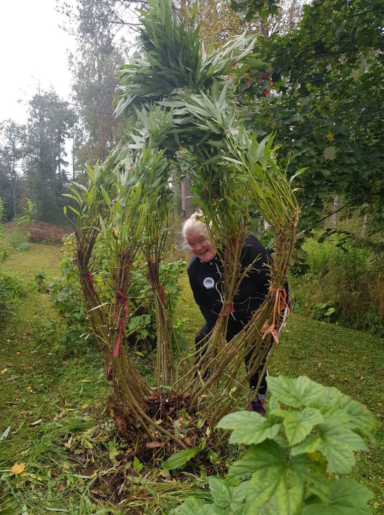 Eira harrastaa puutarhassa ITE-taidetta. Kuvassa teos Kugelan Kruunu.